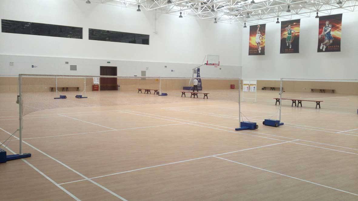 篮球场木地板所用面板均采用进口枫木、柞木或大兴安岭地区正规林场,适用于各类室内体育场馆(篮球馆、羽毛球馆、健身馆、柔道场等),亦适用于舞台、舞蹈训练中心、训练厅等。体育馆实木地板结构包括双层龙骨枫木篮球木地板系统,双层龙骨柞木篮球馆系统,单层龙骨枫木运动馆系统,单层龙骨柞木室内体育馆地板系统等,龙骨全部采用经久耐用的樟子松,橡胶垫采用天然环保胶,无污染、无气味,所有辅材均高于国家规定环保标准。 训练馆使用的运动木地板与专业比赛的运动木地板的差别在于面板的品质和木龙骨的规格。训练馆运动木地板对于技术性能和运动性能的要求要低于专业比赛的体育专用木地板。